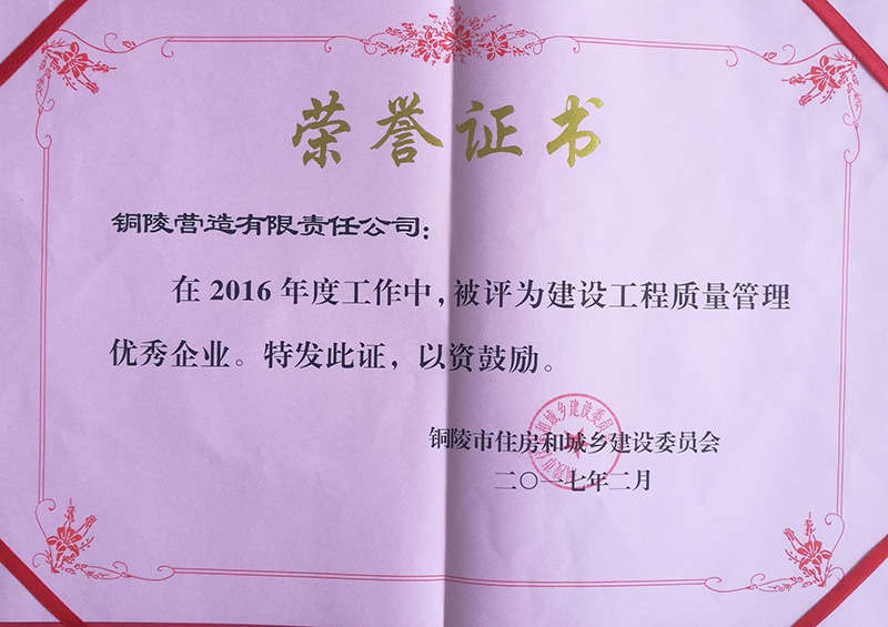 銅陵營造有限責(zé)任公司是國家住建部核準的房屋建筑總承包一級企業(yè)。2006年7月,企業(yè)二次改制為民營企業(yè),并更名為“銅陵營造有限責(zé)任公司”。目前,公司擁有房建施工總承包、市政公用工程總承包、鋼結(jié)構(gòu)專業(yè)工程承包、建筑裝修裝飾專業(yè)工程承包四項壹級資質(zhì),機電安裝、起重設(shè)備安裝、建筑幕墻三項貳級資質(zhì),地基與基礎(chǔ)一項叁級資質(zhì)。2008年通過北京恩格威ISO9001、ISO14001和OHSAS18001“三合一”體系認證。